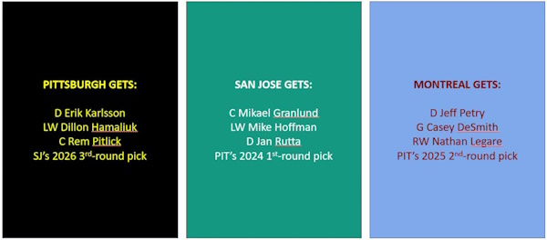 San Jose also retains $1.5M of Karlsson’s $11.5M contract, but the Pens retain a similar amount of Jeff Petry’s, so from the Pens’ standpoint it evens out.